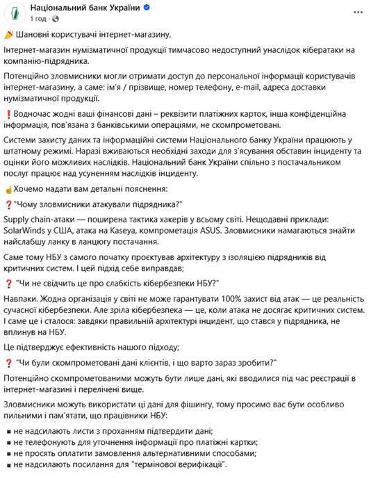 Нацбанк признал, что взломщики могли получить доступ к персональной информации пользователей интернет-магазина: получить их имена и фамилии, номера телефонов, адреса электронной почты и доставки нумизматической продукции.