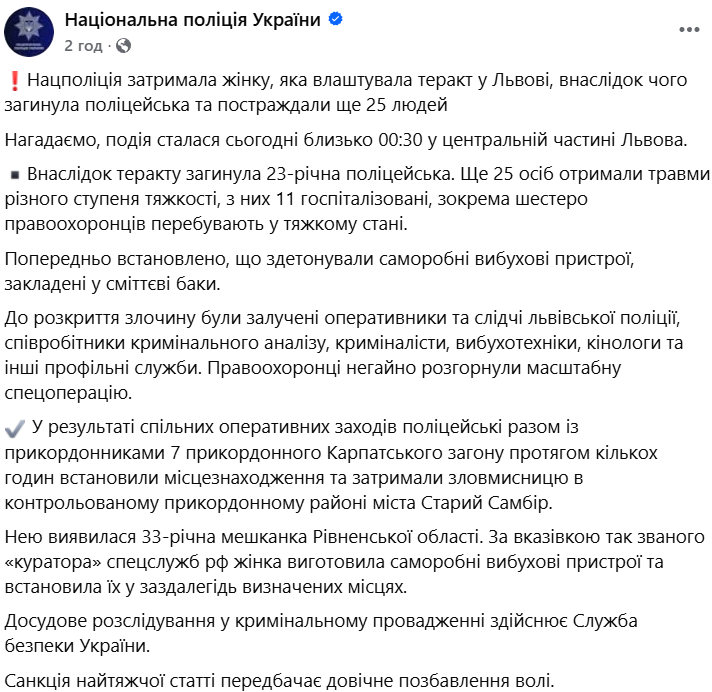 Напомним, после двух взрывов во Львове погибла 23-летняя полицейская Виктория Шпилька.