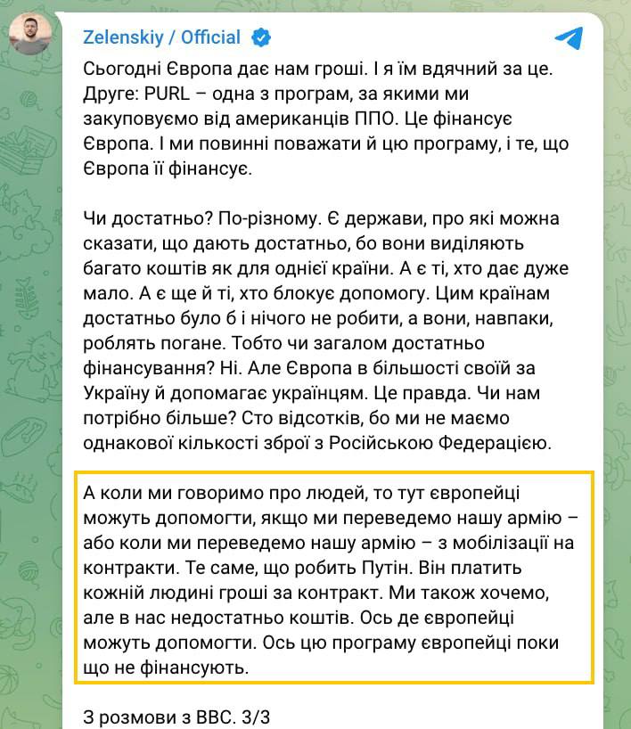 Зеленский считает, что европейские страны могли бы профинансировать переход от мобилизационной модели к контрактной системе. По его словам, в России военнослужащим платят за подписание контракта, и Украина хотела бы действовать так же, однако не имеет достаточных средств.