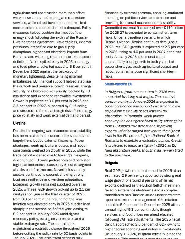 "В базовом сценарии, при котором война России против Украины продолжается в течение всего 2026 года, ожидается, что реальный рост ВВП составит 2,5% в 2026 году, увеличившись до 4,0% в 2027 году, если война закончится. Мирное соглашение, заключенное в начале 2026 года, может существенно ускорить рост в оба года, но дефицит электроэнергии, слабые показатели сельскохозяйственного производства и ограничения на рынке труда представляют собой значительные краткосрочные риски", - отмечается в докладе.