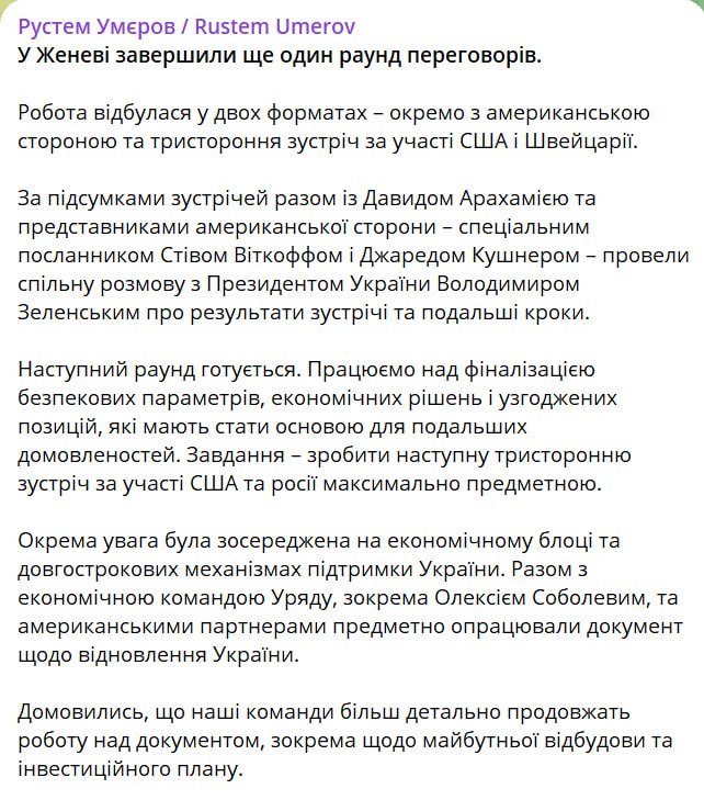 "Работаем над финализацией параметров безопасности, экономических решений и согласованных позиций, которые должны стать основой для дальнейших договоренностей. Задача – сделать следующую трехстороннюю встречу с участием США и России максимально предметной", – написал он.