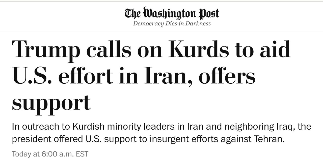 По информации издания, Трамп в ходе переговоров с лидерами курдского меньшинства в Иране и соседнем Ираке предложил "широкую воздушную поддержку со стороны США" и другую помощь антирежимным иранским курдам для захвата части западного Ирана.