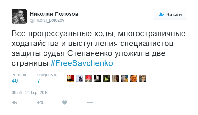 По его мнению, сомнительные процедуры и решения судьи показывают презрение к надлежащему судопроизводству и лишают Савченко надежды на доказательство своей невиновности.