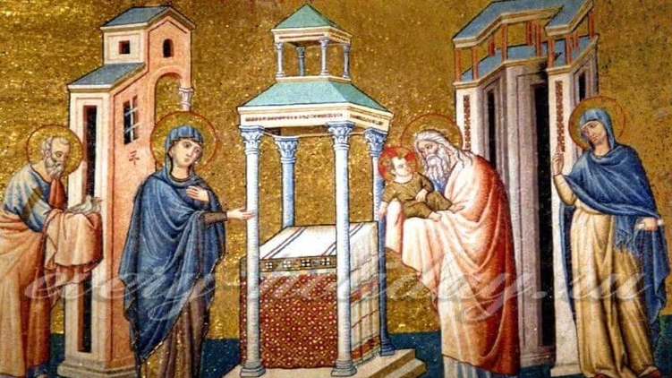 Богоприимец Симеон взял Богомладенца на руки, и, благословив Его, пророчествовал о Спасителе: "Ныне отпущаеши раба Твоего, Владыко, по глаголу Твоему с миром: яко видеста очи мои спасение Твое, еже еси уготовал пред лицем всех людей: свет во откровение языком, и славу людей Твоих Израиля".