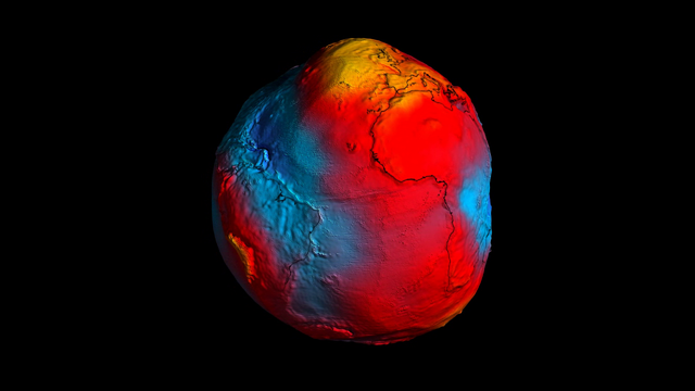 И один дополнительный факт. Все мы видели фото из космоса и знаем, что Земля выглядит как немного сплюснутый с полюсов шар. Но на самом деле наша планета выглядит вот так. А сглаживается ее форма благодаря атмосфере.