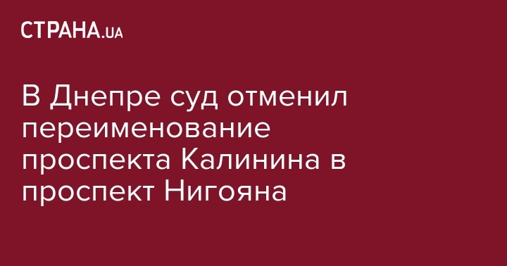 Апелляционный административный суд Днепра отменил решение городского совета о переименовании проспекта Калинина в проспект Сергея Нигояна, одного из героев Небесной сотни. Об этом "Радио Свобода", ссылаясь на информацию жителей города,  которые были против переименования и обратились с иском в суд.