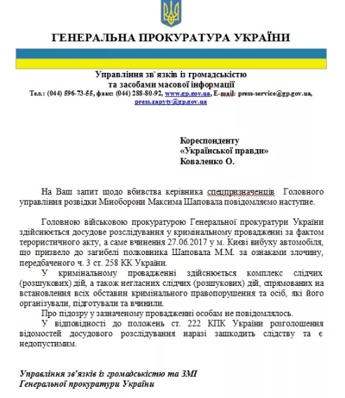 "Главной военной прокуратурой Генеральной прокуратуры Украины осуществляется досудебное расследование в уголовном производстве по факту террористического акта, а именно совершение 27.06.2017 в г. Киеве взрыва автомобиля, что привело к гибели Шаповала М.М. по признакам преступления, предусмотренного ч.3 ста.258 УК Украины ", - говорится в документе.