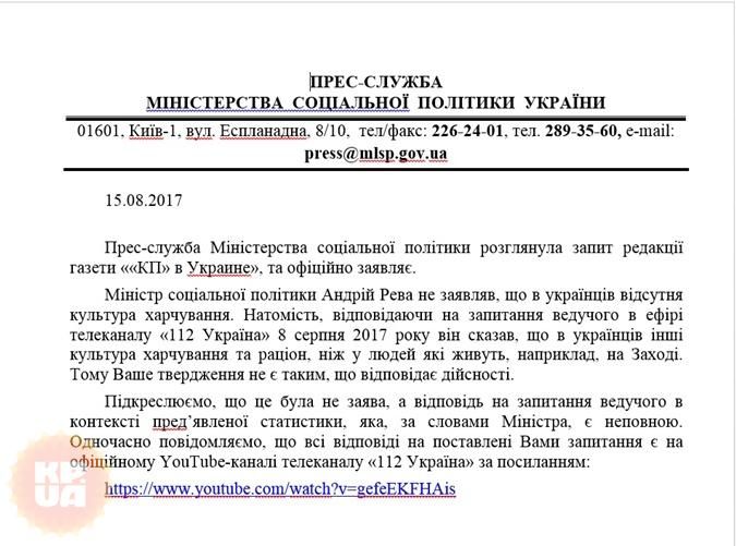 "Министр социальной политики Андрей Рева не заявлял, что у украинцев отсутствует культура питания. Отвечая на вопрос ведущего в эфире телеканала "112 Україна" 8 августа 2017 года, он сказал, что у украинцев другие культура питания и рацион, нежели у людей, которые живут, например, на Западе. Поэтому ваше утверждение не соответствует действительности" - сказано в ответе.
