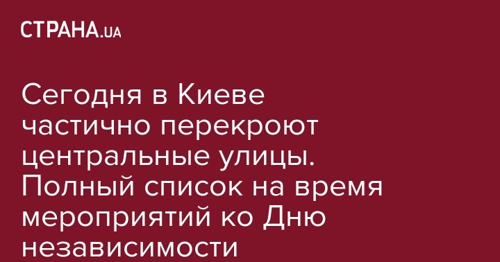 Из-за мероприятий ко Дню Независимости в Киеве с 21 до 28 августа будет перекрыт Крещатик. Ограничения движения продлятся с 21.00 21 августа до 06.00 28 августа. Об этом сообщает пресс-служба КГГА.