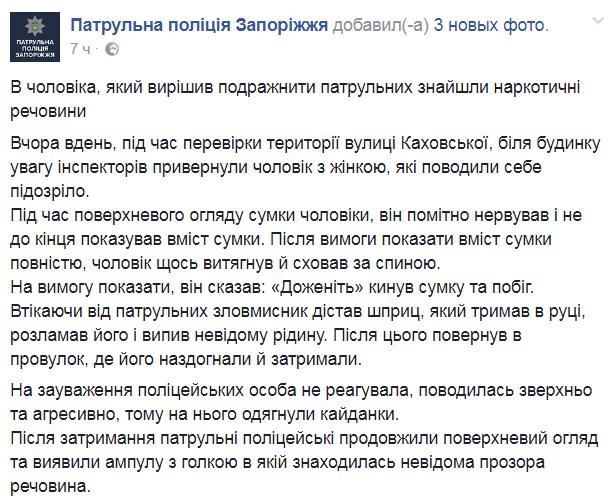 Об этом на Facebook сообщает пресс-служба патрульной полиции Запорожья.