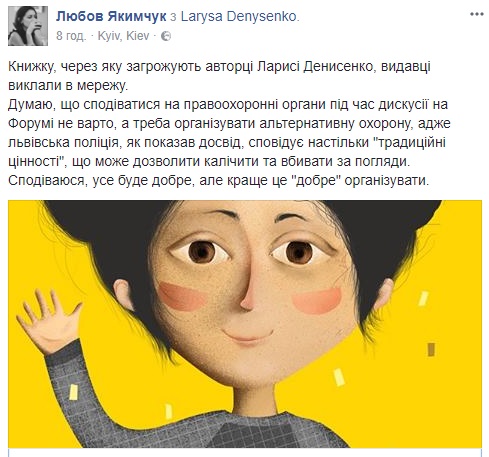 Во Львове в рамках международного Форума издателей отменили презентацию детской книги Ларисы Денисенко "Майя и ее мамы", которая повествует про воспитание детей в однополых браках. Об этом сообщает "Апостроф".