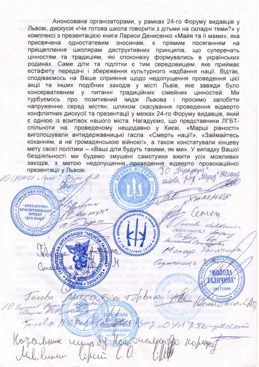 В письме говорится, что запланированная презентация, а также дискуссия "Готова ли школа говорить с детьми на сложные темы" "являются прямым посягательством на привитие школьникам деструктивных принципов, противоречащих ценностям и традициям, которые испокон веков формировались в украинских семьях".