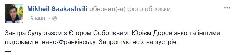 Экс-губернатор Одесской области Михаил Саакашвили со своими сторонниками проведут митинг в Ивано-Франковске в субботу, 16 сентября. Об этом Саакшвили написал на своей странице в Facebook.