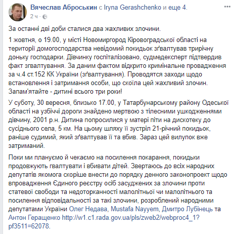 "Ребенок попросился у матери пойти на дискотеку в соседнее село, 5 км. На этом пути ее встретил 21-летний подонок, ранее судимый, который изнасиловал ее и убил. Сейчас это отродье уже задержано", - написал Аброськин