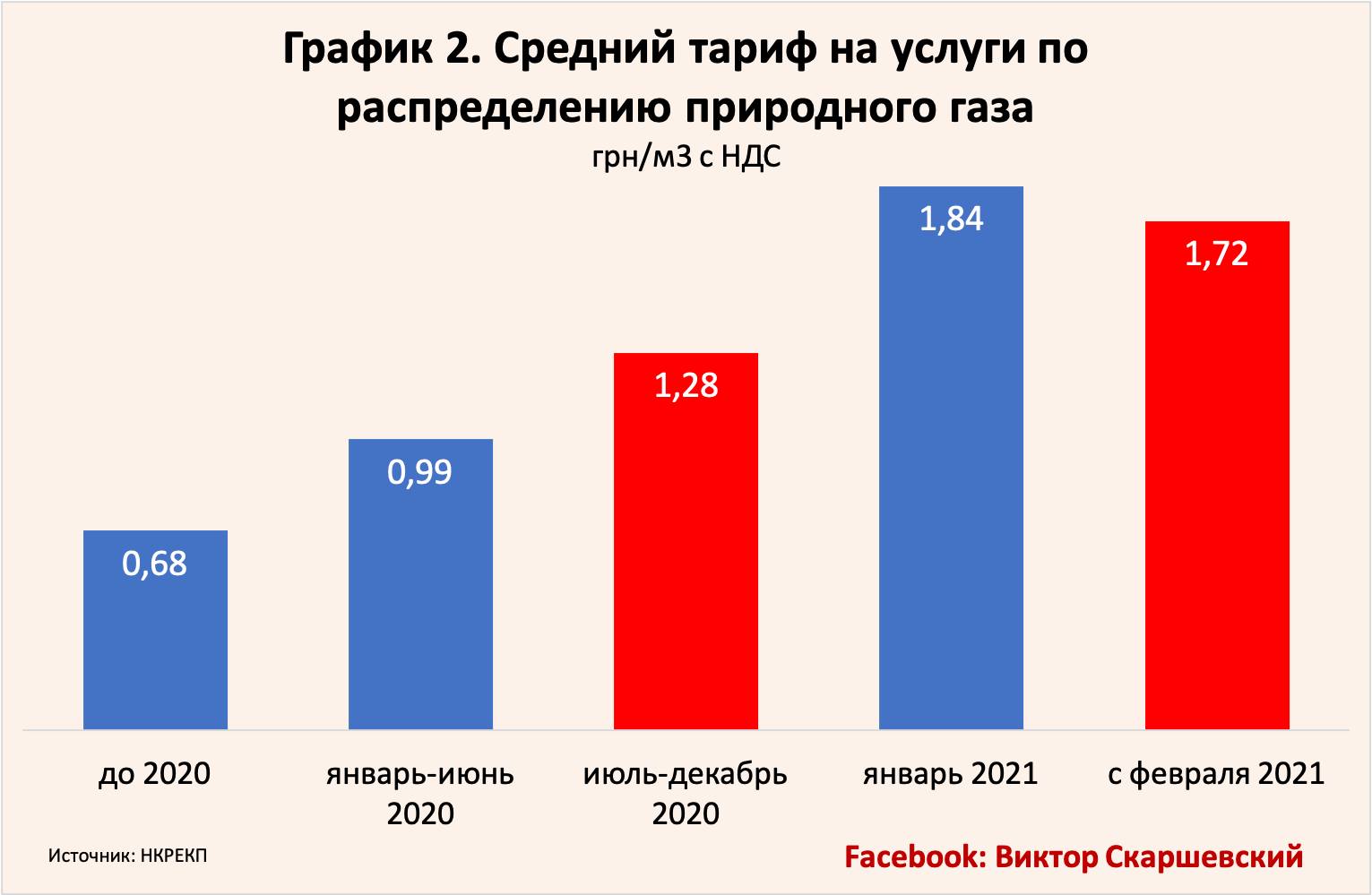 Та же история и с тарифом на услуги по распределению газа, который, после установления верхнего предела в феврале 1,79 грн/м3 (2,15 грн/м3 с НДС), увеличится феврале 2021 года в среднем на 35% по сравнению с декабрем 2020 года (см. График 2).