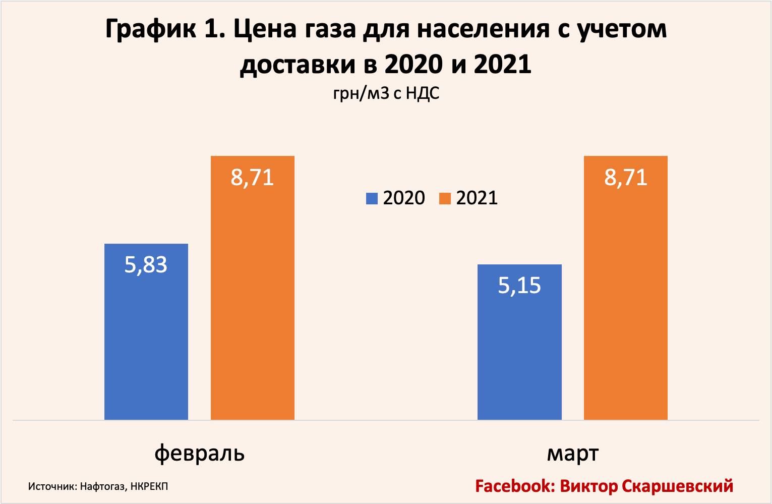 Ведь после установления верхней «сниженной» цены на газ для населения в 6,99 грн/м3, мы будем платить с учетом транспорта в феврале-марте 2021 года в среднем 8,71 грн/м3, что в 1,5-1,7 раза больше (!), чем за аналогичный период 2020 года, когда цена составляла 5,15-5,83 грн/м3 (см. График 1).