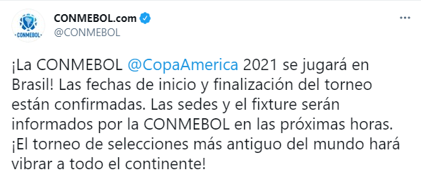 "Кубок Америки в 2021 году сыграют в Бразилии! Подтверждаются даты начала и окончания турнира. CONMEBOL проинформирует о местах проведения мероприятия в ближайшие несколько часов. Старейший в мире турнир национальных сборных заставит задрожать весь континент!" - говорится в сообщении Конфедерации южноамериканского футбола в Тwitter.