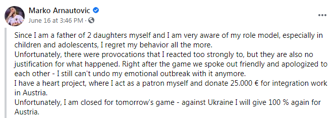 "Я отец двух дочерей и осознаю свою ответственность как примера для подражания, особенно для для детей и подростков. Поэтому я сожалею о своем поступке еще сильнее. К сожалению, были провокации, на которые я слишком сильно отреагировал, но они тоже не оправдывают произошедшего. Сразу после игры мы дружно высказались и извинились друг перед другом, но я до сих пор не могу больше отменить эмоциональную вспышку. У меня есть сердечный проект, где я сам выступаю в роли покровителя и жертвую 25.000 € на интеграционную работу в Австрии. К сожалению, на следующую игру я дисквалифицирован, однако против Украины я выложусь на все сто процентов", – написал Арнаутович на своей странице в Facebook.