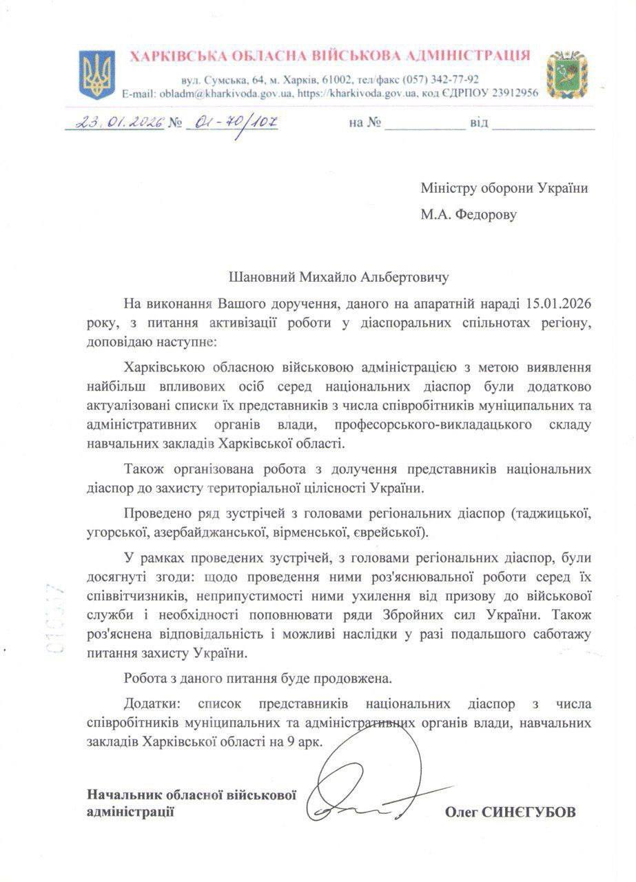 До свого звіту «чиновник» з адміністрації додаєсписок представників діаспор з числа співробітників органів влади, навчальних закладів Харківської області.
