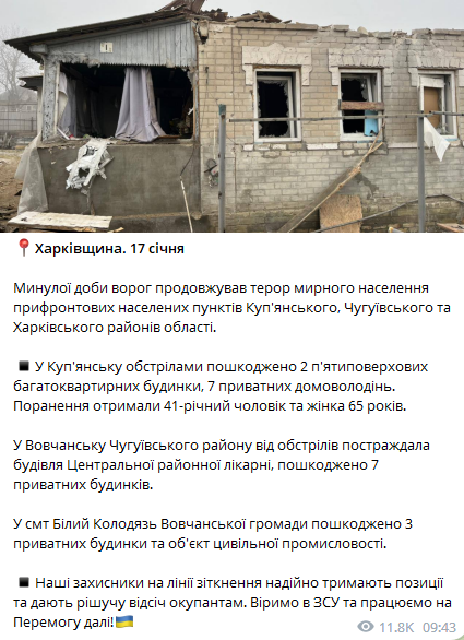 "У Куп'янську обстрілами пошкоджено 2 п'ятиповерхові багатоквартирні будинки, 7 приватних домоволодінь. Поранення отримали 41-річний чоловік і жінка 65 років. У Вовчанську Чугуївського району від обстрілів постраждала будівля Центральної районної лікарні, пошкоджено 7 приватних будинків", - повідомив Синєгубов.
