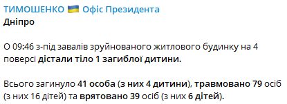 "Дніпро. О 09:46 з-під завалів зруйнованого житлового будинку на 4 поверсі дістали тіло однієї загиблої дитини. Усього загинула 41 особа (з них 4 дитини), травмовано 79 осіб (з них 16 дітей) та врятовано 39 осіб (з них 6 дітей)", - написав заступник голови Офісу президента Кирило Тимошенко у себе в телеграм-каналі.