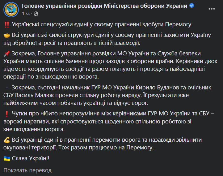 А у повідомленні ГУР окремо акцентується, що "чутки про нібито розбіжності між керівниками ГУР МО України та СБУ – ворожі наративи, які спростовуються щоденною спільною роботою зі знешкодження ворога".