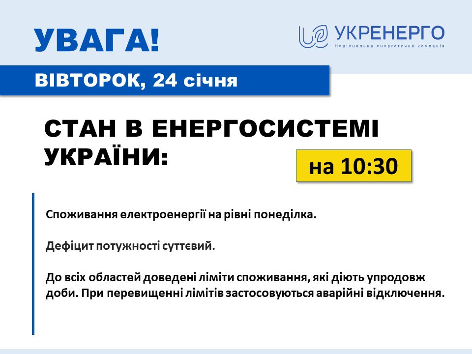 У вівторок, 24 січня, в Україні споживання електроенергії залишається на понеділковому рівні. Виробництво електроенергії трохи збільшилося, проте дефіцит потужності залишається суттєвим.