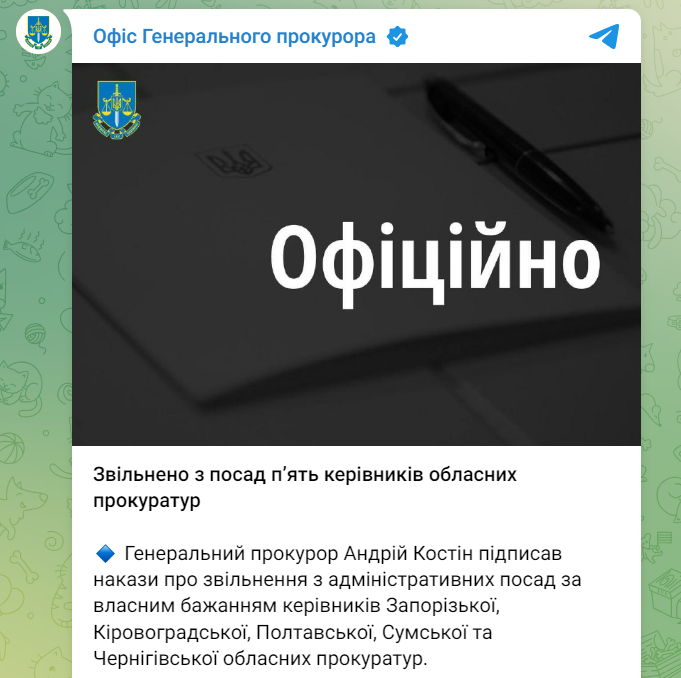 Зокрема, звільнено голів Запорізької, Кіровоградської, Полтавської, Сумської та Чернігівської обласних прокуратур.