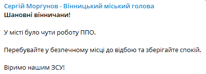 "Шановні вінничани! У місті було чути роботу ППО. Перебувайте в безпечному місці до відбою та зберігайте спокій. Віримо нашим ЗСУ!", - повідомляє міський голова Вінниці Сергій Моргунов у своєму телеграм-каналі.