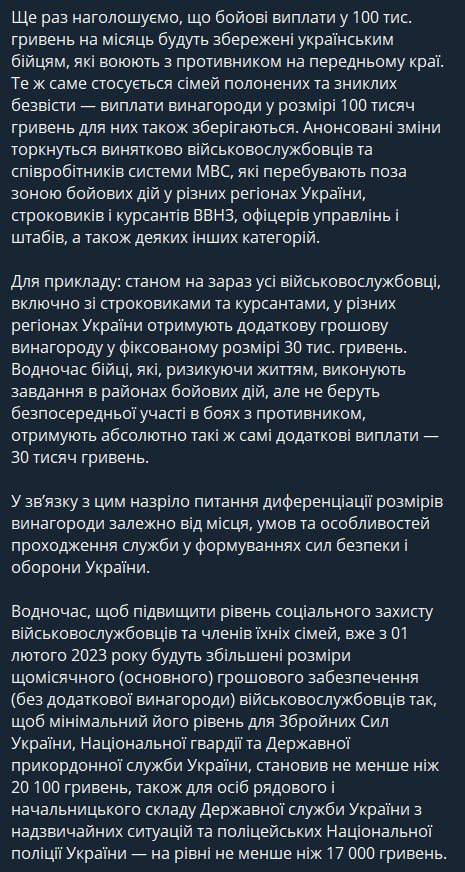 "Анонсовані зміни торкнуться тільки військовослужбовців та співробітників системи МВС, які перебувають поза зоною бойових дій у різних регіонах України, терміновиків та курсантів вузів, офіцерів управлінь та штабів, а також деяких інших категорій", - йдеться у заяві, проте не уточнюється якісь конкретно зміни для цих категорій військовослужбовців відбудуться. Заявляється лише, що буде впроваджено певну диференціацію з виплат.