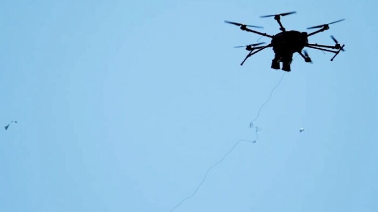 На відео видно, як безпілотник викидає мережу, де заплутується ворожий БПЛА і падає.