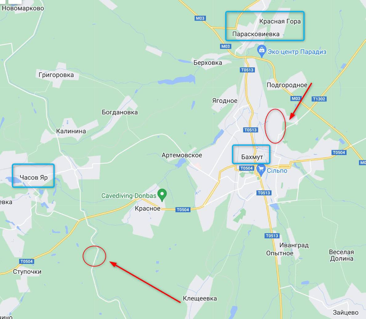 Судячи з карти, росіяни підійшли до водного каналу, який перетинає цю трасу в районі розв'язки. Це менше двох кілометрів від дороги на Годинник Яр.