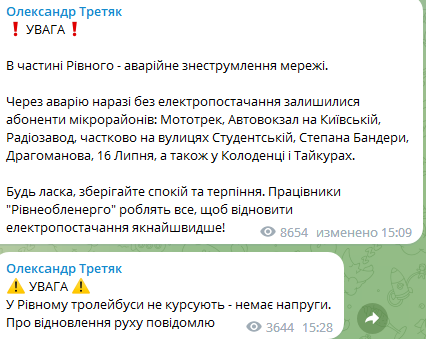 "Будь ласка, зберігайте спокій і терпіння. Працівники "Рівнеобленерго" роблять все, щоб відновити електропостачання якнайшвидше", - додав Третяк.