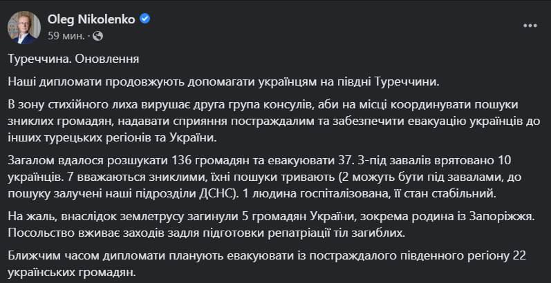 "Внаслідок землетрусу загинули 5 громадян України, у тому числі сім'я із Запоріжжя. Посольство вживає заходів щодо підготовки репатріації тіл загиблих", - повідомив спікер.
