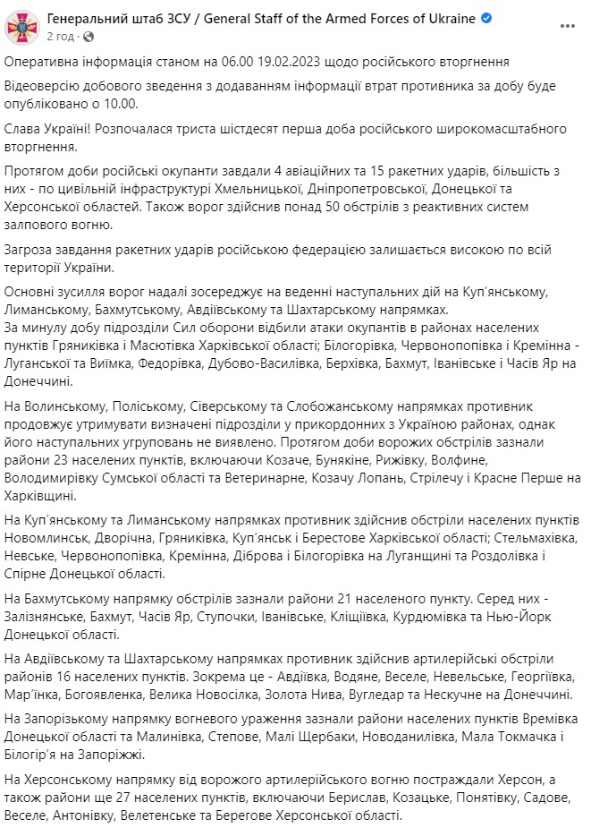 У неділю, 19 лютого, в Україні триває вже 361 день війни з РФ.