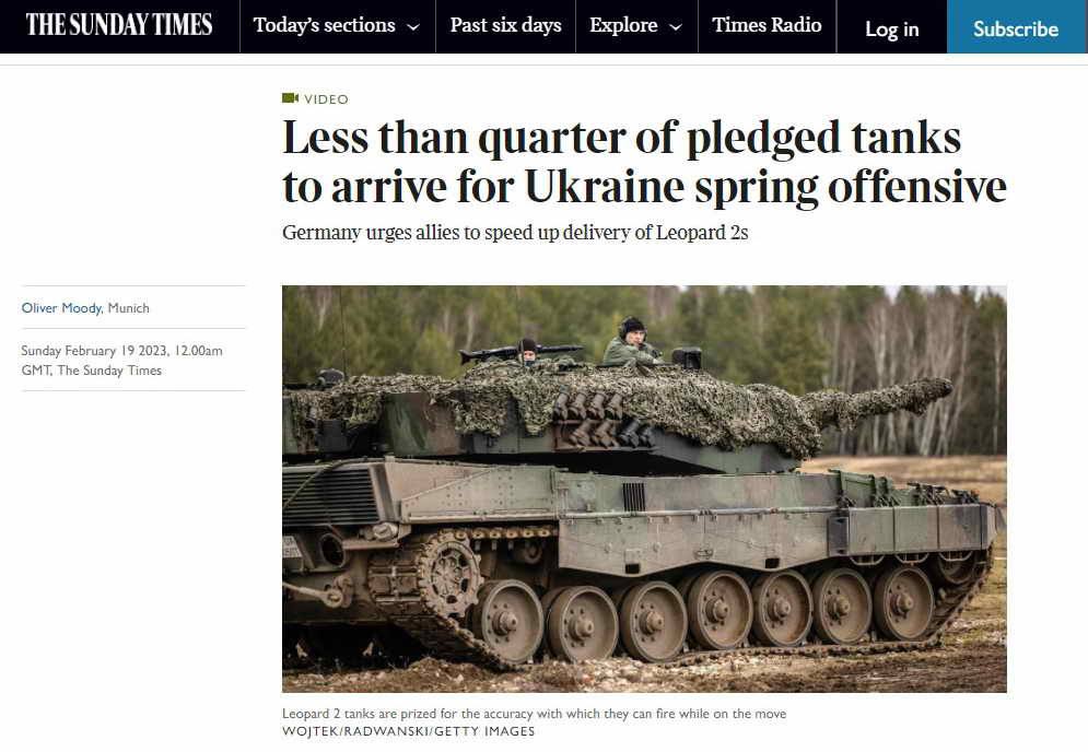 13:16 До квітня Україна, схоже, отримає лише 50 танків. Це лише близько чверті від кількості танків, які їй пообіцяли надати партнери, повідомляє The Times.