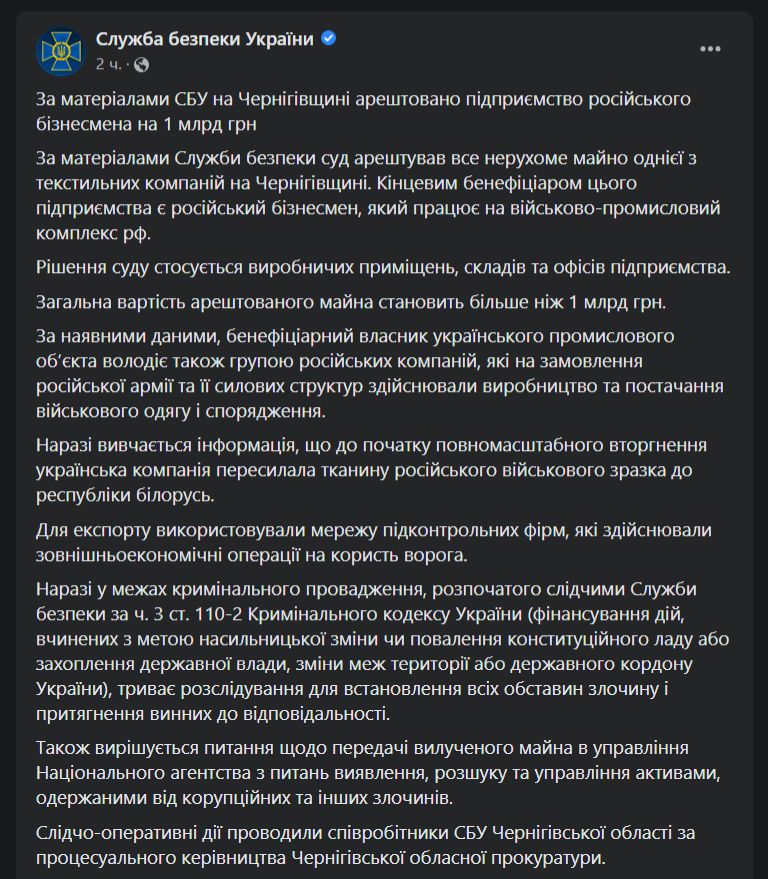 "За матеріалами Служби безпеки суд заарештував усе нерухоме майно однієї із текстильних компаній у Чернігівській області. Кінцевим бенефіціаром цього підприємства є російський бізнесмен, який працює на військово-промисловий комплекс РФ", - йдеться у повідомленні української спецслужби.