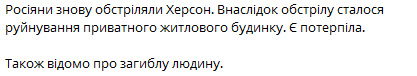 За його даними, внаслідок обстрілу є потерпіла. Також відомо про загиблу людину.