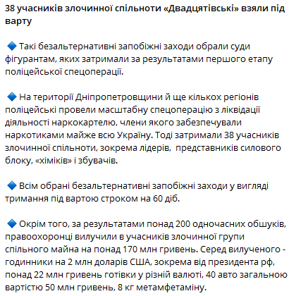 Також повідомлялося, що у Кривому Розі було затримано ще 10 учасників наркокартелю "Двадцатівські", який постачав наркотиками всю Україну.
