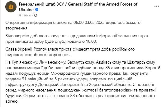 Вранці 3 березня Генштаб ЗСУ оприлюднив зведення про ситуацію на фронті.
