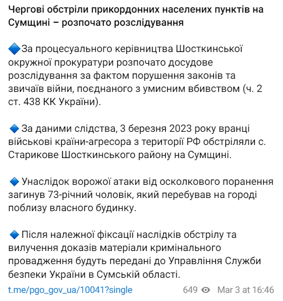 Офіс генерального прокурора повідомив, що вранці російські військові з території РФ обстріляли с. Старикове Шосткинського району.