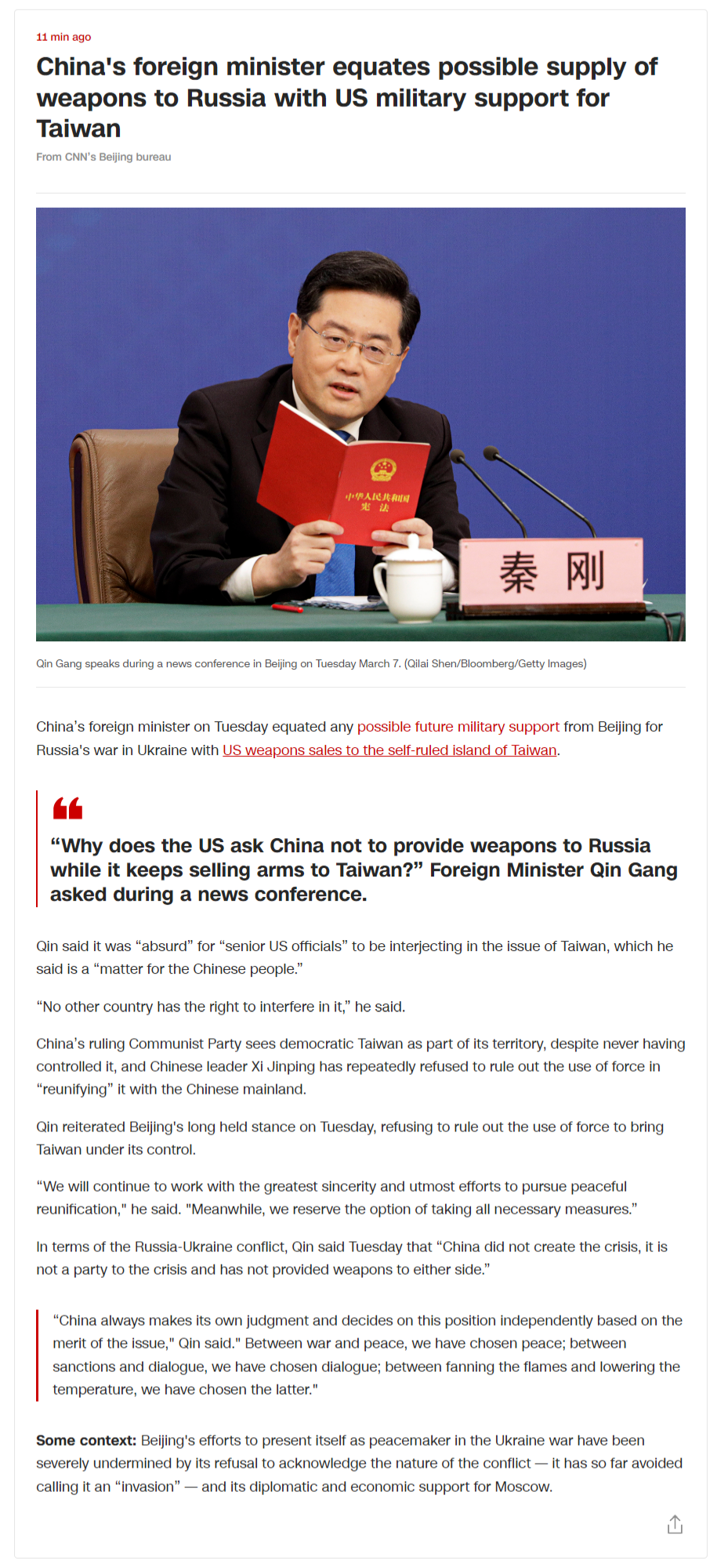 "Чому США просять Китай не постачати зброю Росії, тоді як вони продовжують продавати зброю Тайваню?" - запитав міністр закордонних справ Цинь Ган під час прес-конференції.