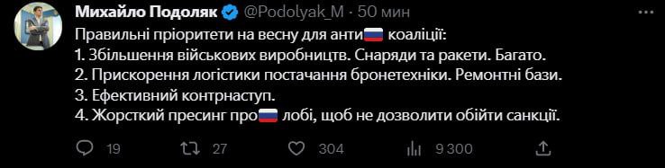 Радник голови Офісу президента Михайло Подоляк перелічив "правильні пріоритети на весну для антиросійської коаліції".