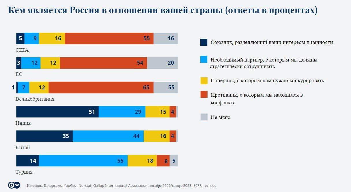 Також, незважаючи на війну, більшість жителів Індії (80%), Китаю (79%) та Туреччини (69%) вважають Росію "союзником", або "партнером". У Європі та США переважає думка, що Росія є "противником" або "суперником".