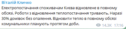 "Наразі 30% будинків без опалення. Відновити тепло у повному обсязі комунальники планують протягом доби", - написав він.
