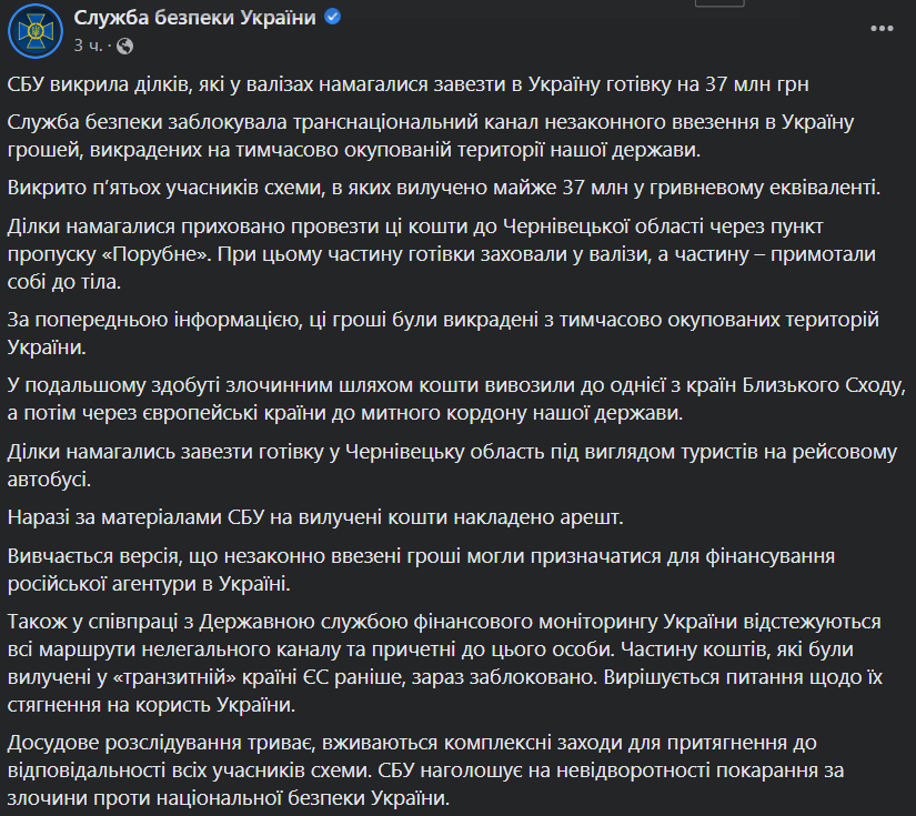 "Служба безпеки заблокувала транснаціональний канал незаконного ввезення в Україну грошей, викрадених на тимчасово окупованій території нашої держави. Викрито 5 учасників схеми, у яких вилучено майже 37 млн. у гривневому еквіваленті", - йдеться у повідомленні СБУ.