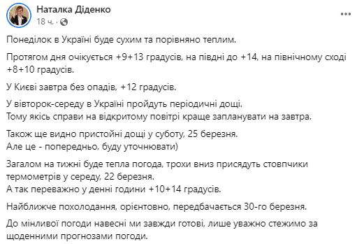 Синоптик Наталія Діденко пише, що понеділок в Україні буде сухим та порівняно теплим. Упродовж дня очікується +9...+13, на півдні до +14, на північному сході +8...+10.