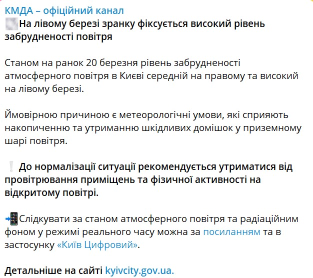 У КМДА уточнили, що рівень забруднення атмосферного повітря на правому березі – середній.