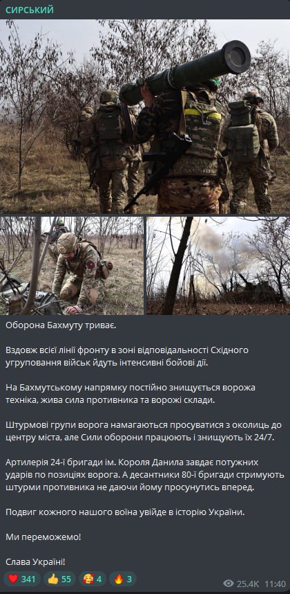 "На Бахмутському напрямку постійно знищується ворожа техніка, жива сила противника та ворожі склади. Штурмові групи ворога намагаються просуватися з околиць до центру міста, але Сили оборони працюють і знищують їх 24/7", - йдеться у повідомленні.