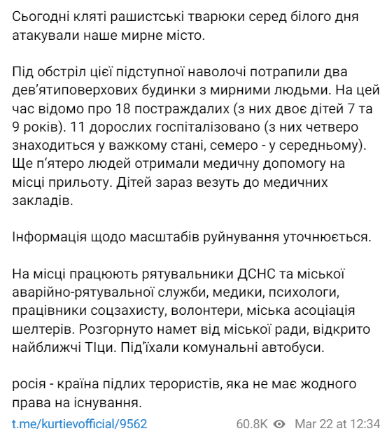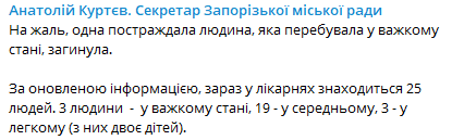 Сьогодні, 22 березня, російські війська обстріляли Запоріжжя, снаряди потрапили до двох дев'ятиповерхових будинків із мирними людьми. У лікарнях перебувають 25 людей. 3 особи – у важкому стані, 19 – у середньому, 3 – у легкому (з них двоє дітей), одна людина загинула.